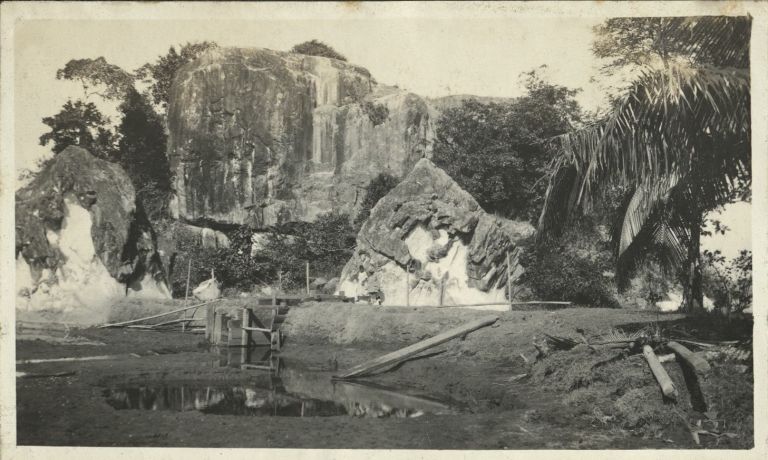 Subject: A small dock in a cove with interesting rock formations. Likely along Subic Bay, and definitely at low tide.
