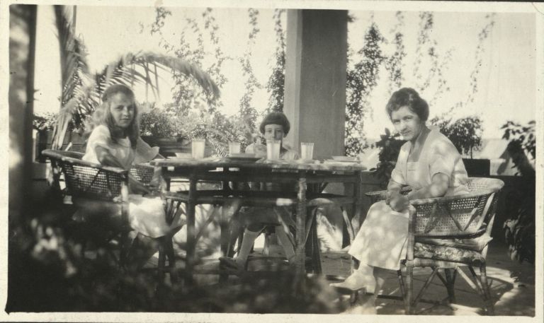 Subject: Finally, we encounter the full names of these two girls, who appear in several photos in this album. Dorothy Reyner is the older girl, and Helen is the younger. Here they sit at a breakfast o