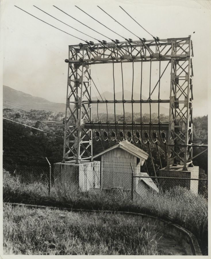 Close-up of electric power transmission tower and lines at the crest of a steep hill near Manila. See also OFI-001207 for another view, this image appears to be the top-most tower.