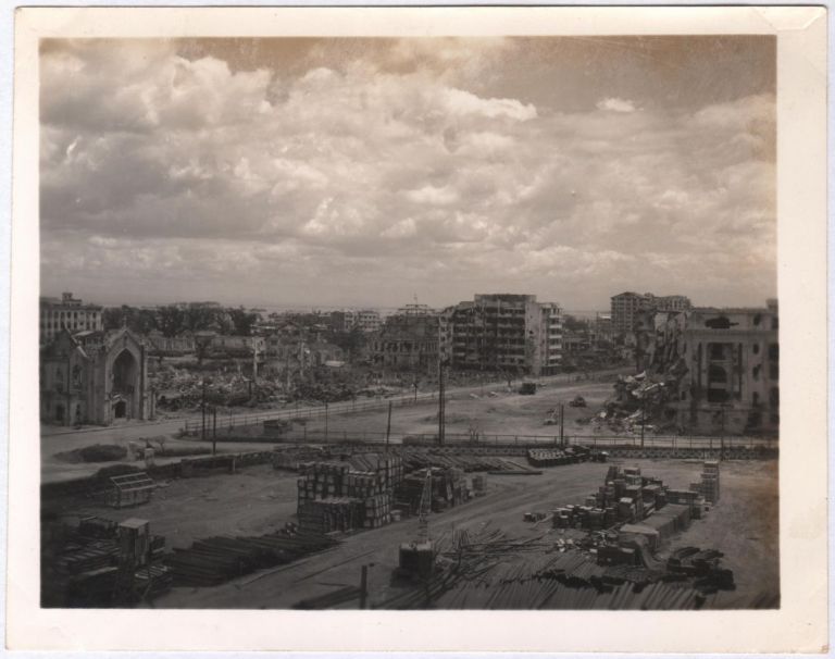 This is Ermita because the distinctive facade of Central United Methodist Church appears far left which is located along Kalaw Street in Manila and on the opposite side of the road is the Agriculture and Commerce Building (now National Museum of National History). Reconstruction is ongoing but remaining buildings are heavily damaged.