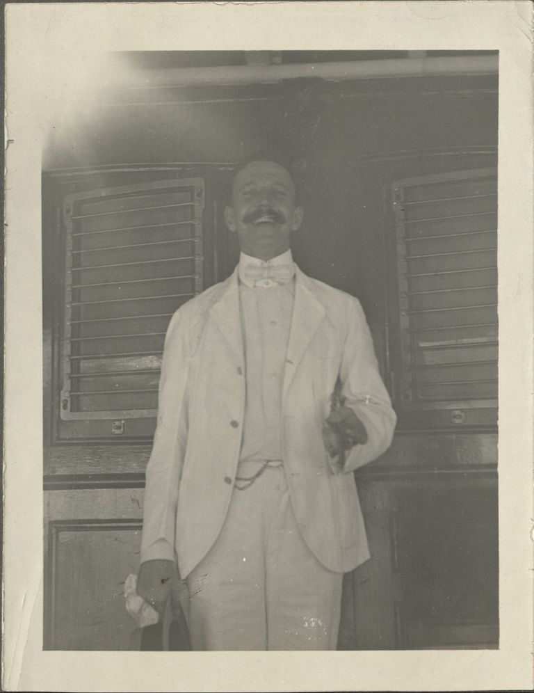 Subject: An expatriate man in white tropical suit laughs at the camera, possibly in Tabaco City in Albay Province.