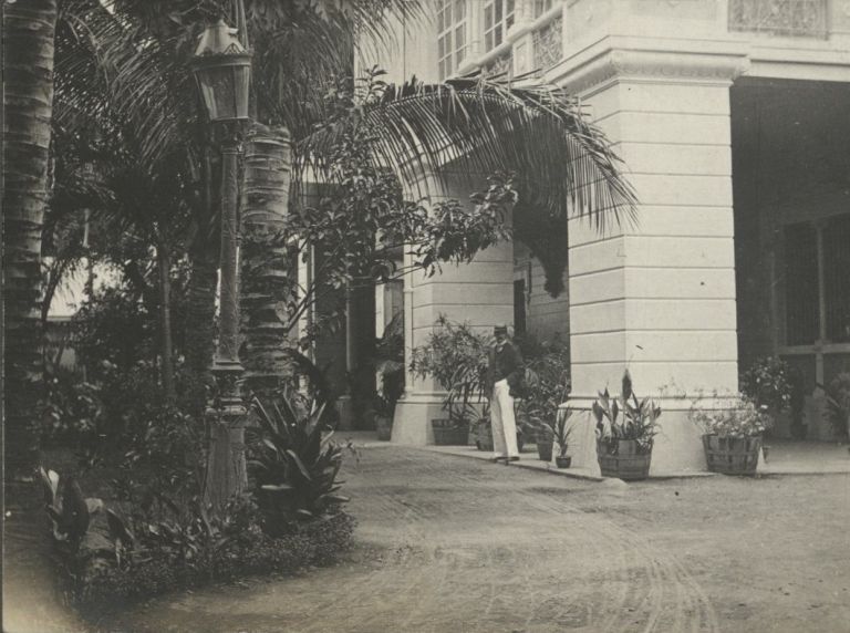 Subject: An expatriate man in formal suit stands in a driveway by a porte cochere in a massive building, possibly a hotel, See OFI-002349 for a similar, but different, image.