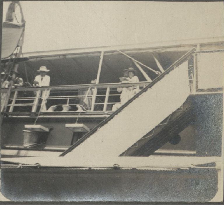 Subject: Expatriates dressed in white look over the railing of an inter-island steamship while at port. Lifeboat hangs on the left. See also OFI-002372 which is very similar.