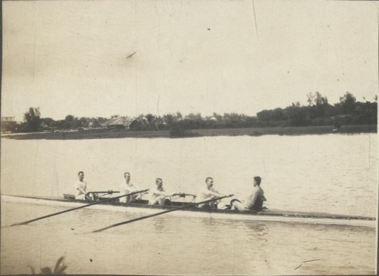 [Untitled - Expatriates rowing in a four-man scull plus coxswain].