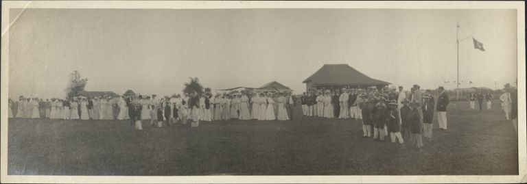 Subject: Truly regretable there is no caption. A group of expatriate men and women in formal dress gather in a big field to watch a performance or event featuring children in costumes resemblin