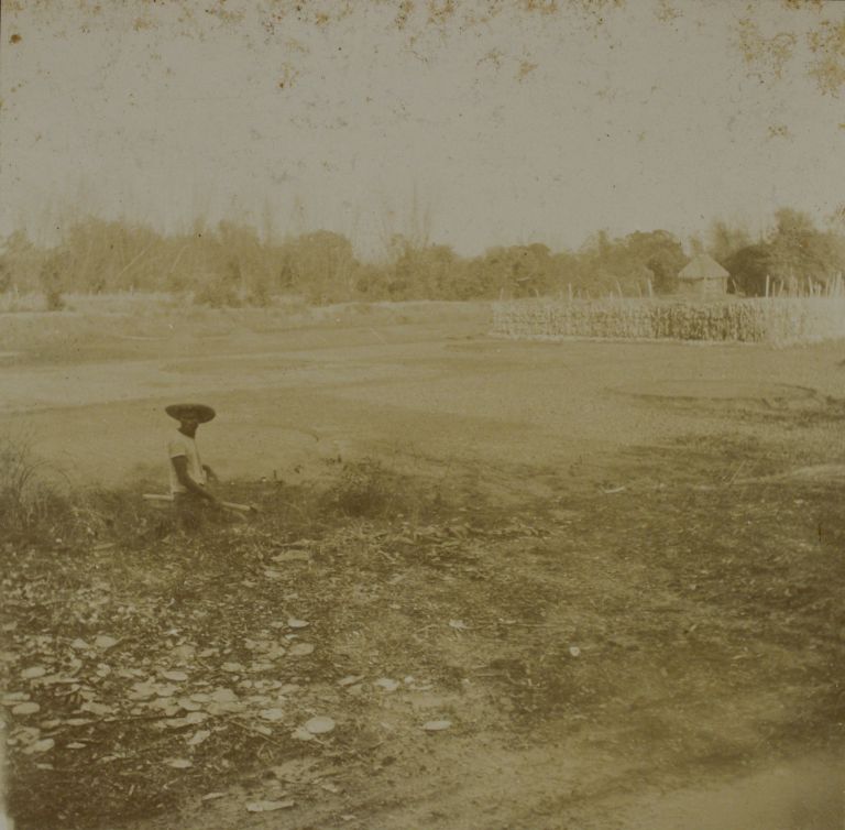 Subject: A Filipino stands beside a rice field with some kind of farm implement. It appears to be the wood frame of a harrow, but details are not clear.