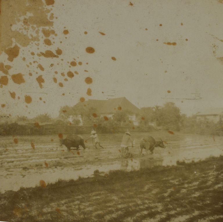 Subject: Two farmers harrowing a rice paddy. After plowing (turning over the soil) comes harrowing. A harrow is an implement consisting of a heavy frame set with teeth or tines that is drag