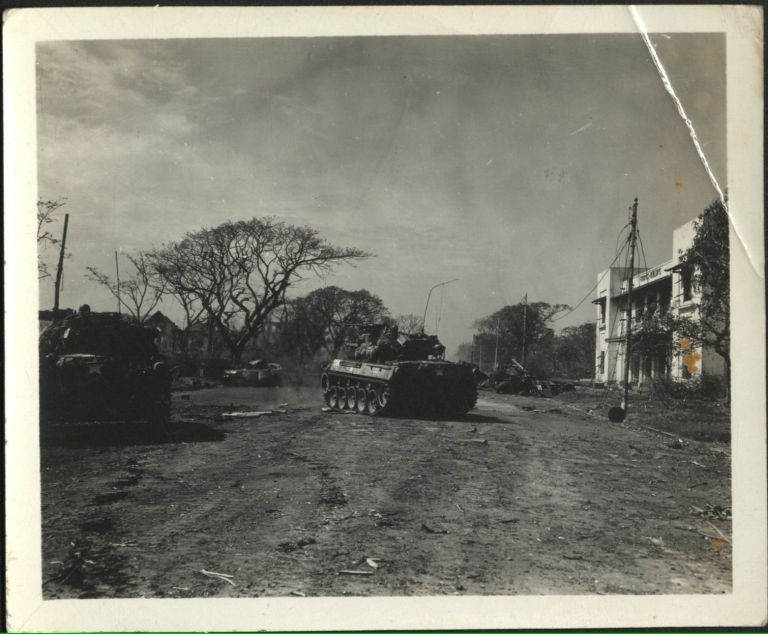 [Untitled - Fighting in Manila during liberation: Armored Personnel carrier advances in Ermita near Finance Building and Central Methodist Church, February 1945].