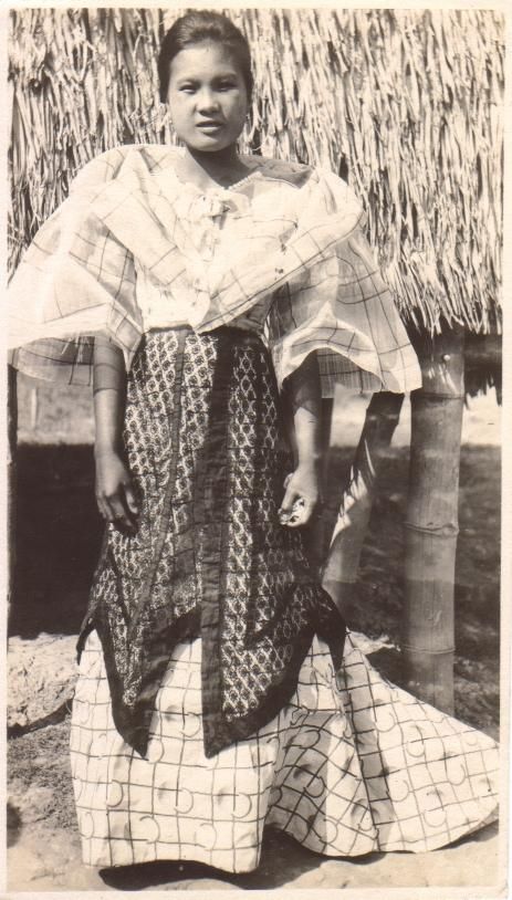 Subject: A Filipina in traditional special-occasion dress stands outside a nipa home. Falling somewhere between everyday "clothing & dress" and formal "costume" in Library of Congress nomenclature, th