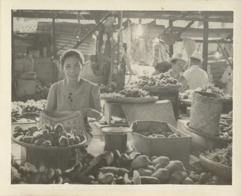 Subject: A Filipina with an inviting smile stands in her market stall filled with vegetables and other produce.