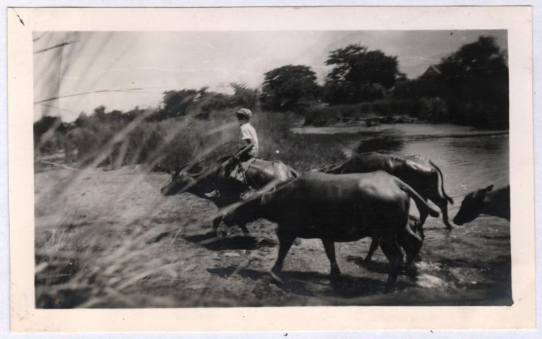 A Filipino boy rides a carabao leading other carabao out onto a riverbank after cooling off in the river.