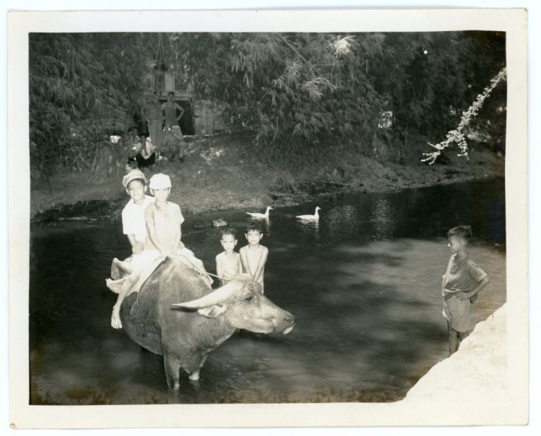Two Filipino boys ride on the back of a carabao standing in a small river while three other boys look on. Two ducks in the background don't seem much interested. Images in this album are from an American soldier in the U.S. Army 13th Air Force stationed at Clark Field.