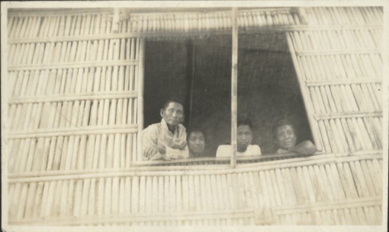 Subject: Filipino family looks out the window of their bamboo-and-nipa house. With glass expensive and easily broken, windows like these, a panel propped open with a pole, are typical of nipa huts.
