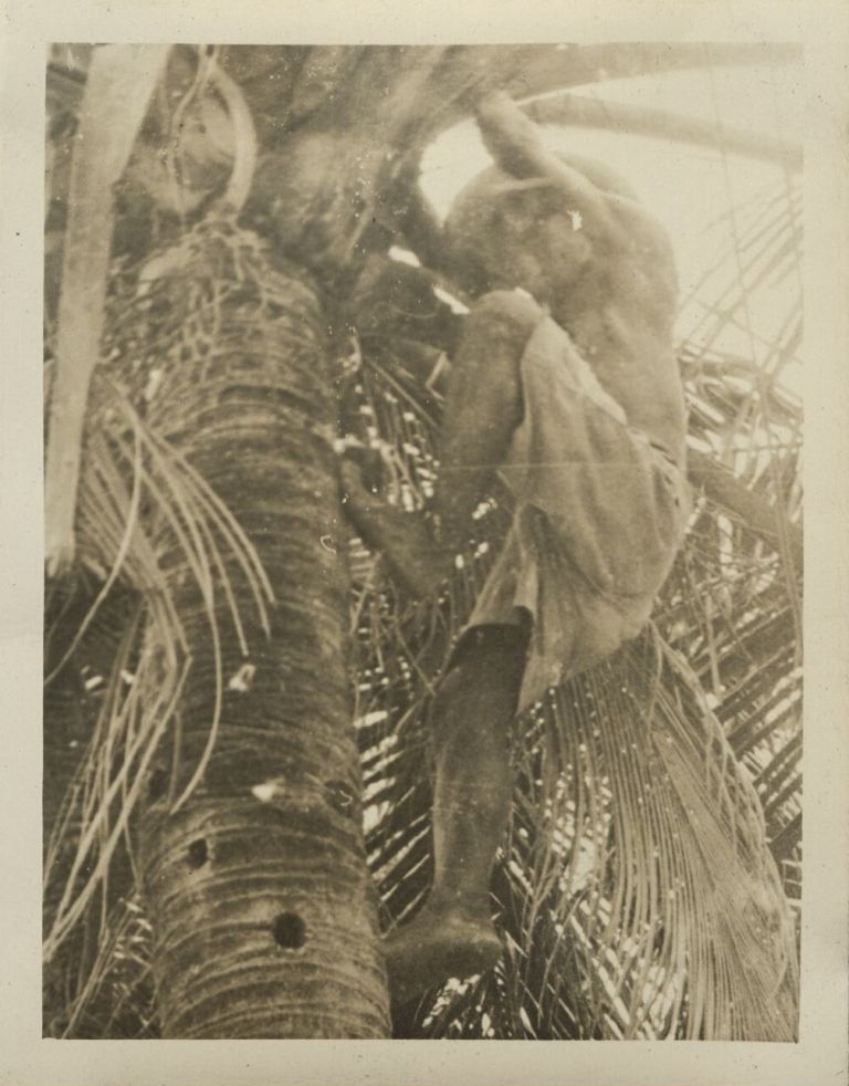 Subject: There's generally only two reasons to climb a palm tree - to knock the coconuts down or to gather tubo. This man (with possibly the world's baggiest shorts) is probably harvesting the coconut