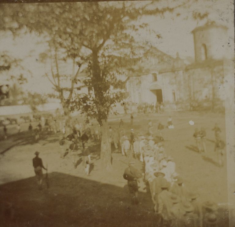 Subject: U.S. soldiers guard Filipino prisoners marching into the plaza at Bacoor, Cavite, after capture. This is probably the same event seen in OFI-002035. The church is St. Michael the A
