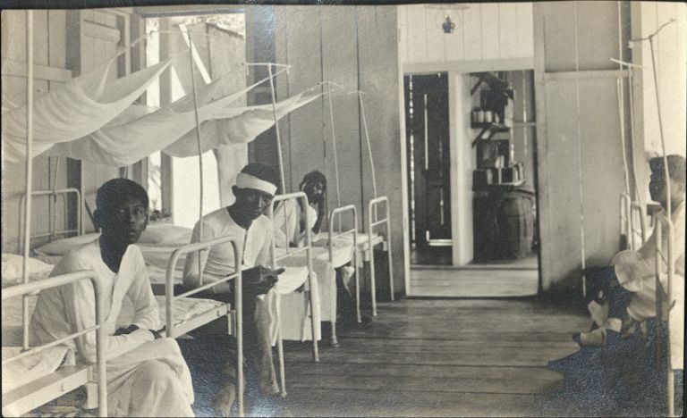 Subject: Four young Filipino men sit next to their beds in a hospital; one has a bandaged head wound.