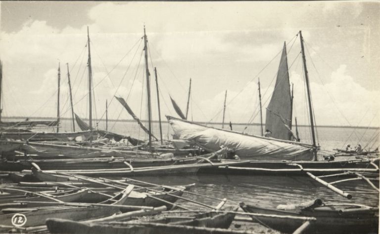 Subject: Group of fishing boats - outrigger canoes, some with sails - in harbor, possibly on Cebu Island.