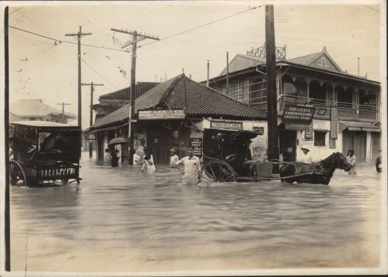 Subject: Calesas and pedestrians navigating flooded Calle Looban, now Carmen St., in Paco, Manila. Hop Lee & Co. grocery store is on the corner. See also ROJR-000287 for a related view on Escolta.