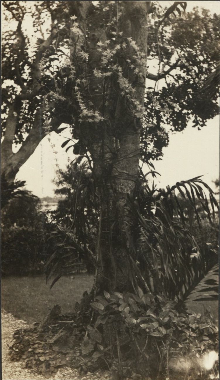 Subject: A flowering vine (perhaps Queen's Wreath?) grows on a tree on a landscaped path by a river.