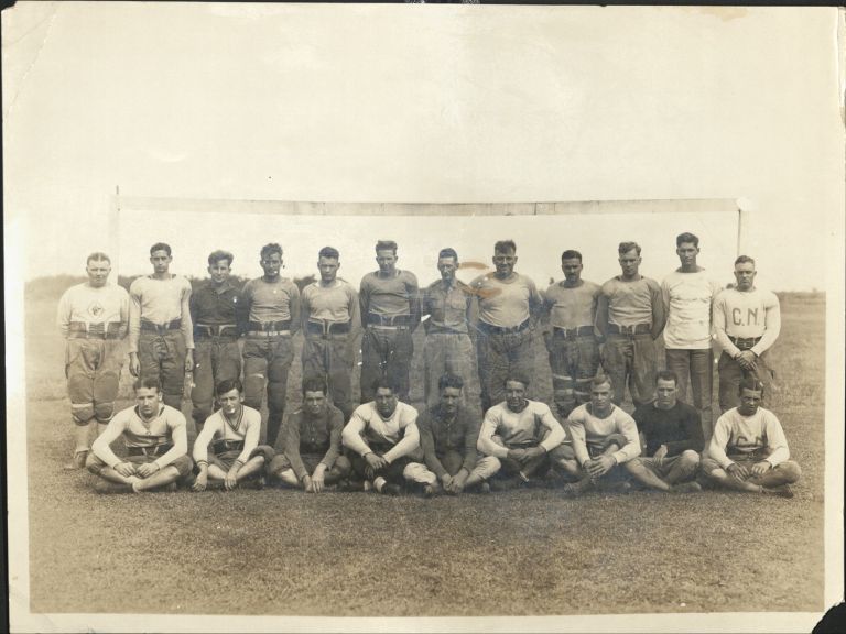 Subject: Twenty-one American men pose in football uniforms on a grassy field in front of a goal. The man standing center in an Army uniform may be Lester Brundege. Likely this squad is composed of Arm