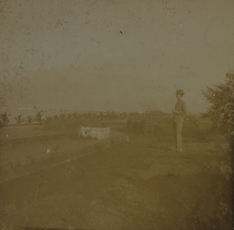 Subject: A U.S. soldier stands in a fort overlooking Manila Bay, probably at Fort San Antonio Abad in Malate (but possibly Fort San Felipe in Cavite). Fort San Antonio Abad was originally b