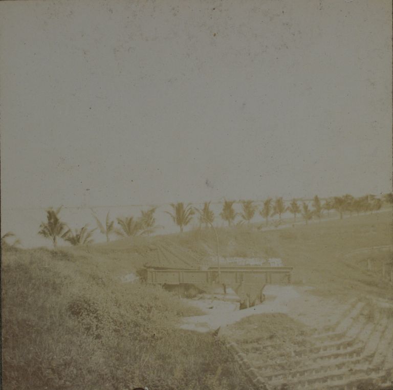 Subject: A gun carriage sits behind an earthen embankment by a palm-lined seashore. This may be the Spanish defenses at Luneta or Fort San Antonio Abad in Malate, or in Cavite. See OFI-0022