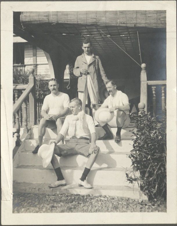 [Untitled - Four expatriate men relax on porch stairs].