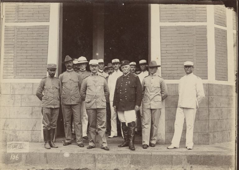 Subject: General Arthur MacArthur and General Elwell Stephen Otis (center left and right), Colonel Funston (far left) with other U.S. officers
