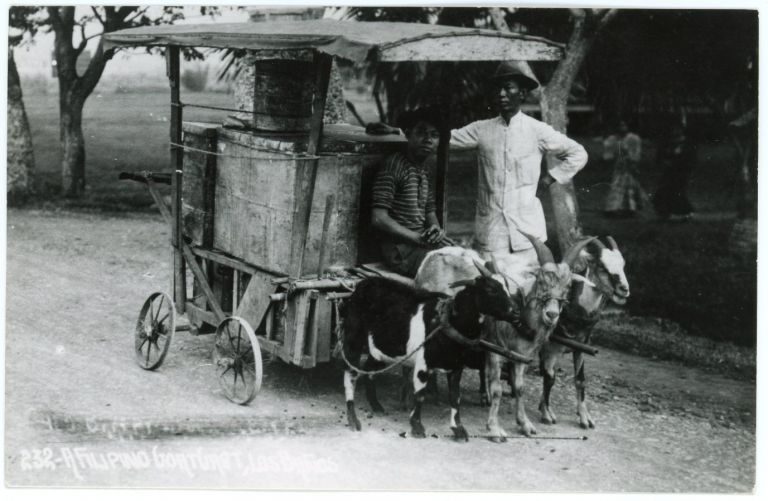 Two men stand by an unusual cart, pulled by three goats, with small metal wheels askew.