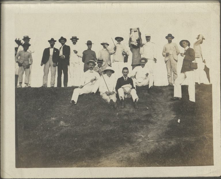 Subject: It's a pity this image isn't captioned. This group of expatriate men standing on a hill, many holding batons and one holding some framed object aloft, supervised by a military man, are clearl