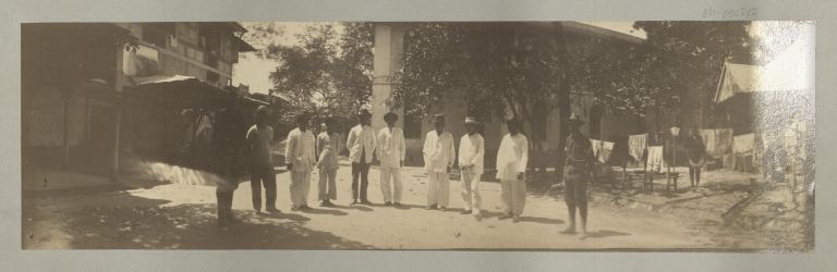 Subject: Panoramic view of 8 Filipinos flanked by two U.S. soldiers, all standing in a semicircle in a street or plaza. Possibly in Intramuros, the building in back may be Ayuntam