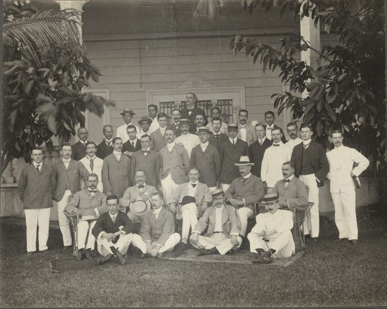 Subject: Group portrait of expatriate Caucasian men outside a large house in the Philippines. Perhaps this is the staff of Macleod & Company, import/export and shipping agents in the Philippines.