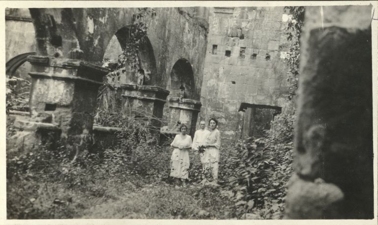 Subject: Americans pose in the ruins of the historic stone church in Makati, the Nuestra Senora de Gracia Church, erected in 1629, also known as Guadalupe Church. The church and monastery were both oc