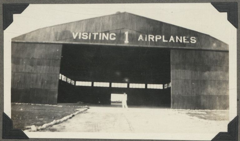 Subject: An empty hangar for visiting airplanes at Clark Field at Camp Stotsenburg. The man in white posing appears to be the same one as in OFI-001294 at the gate of Camp Stotsenburg.