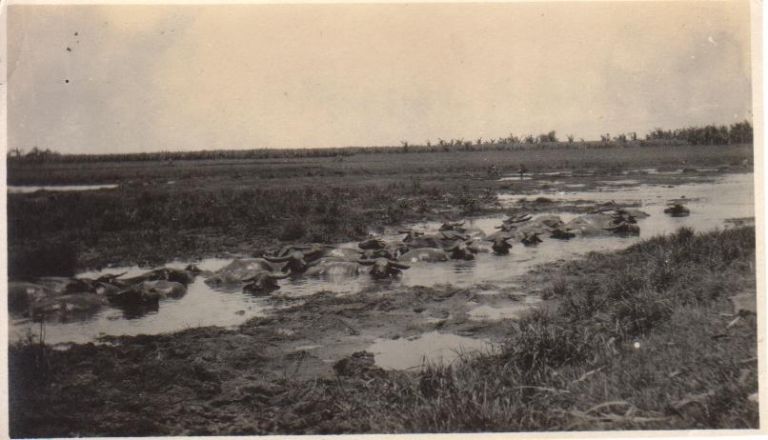 Subject: A herd of carabao cool off in a water hole. Their lack of sweat glands makes it necessary that they be allowed to rest in a water hole every few hours. See also OFI-002087 and OFI-005032.