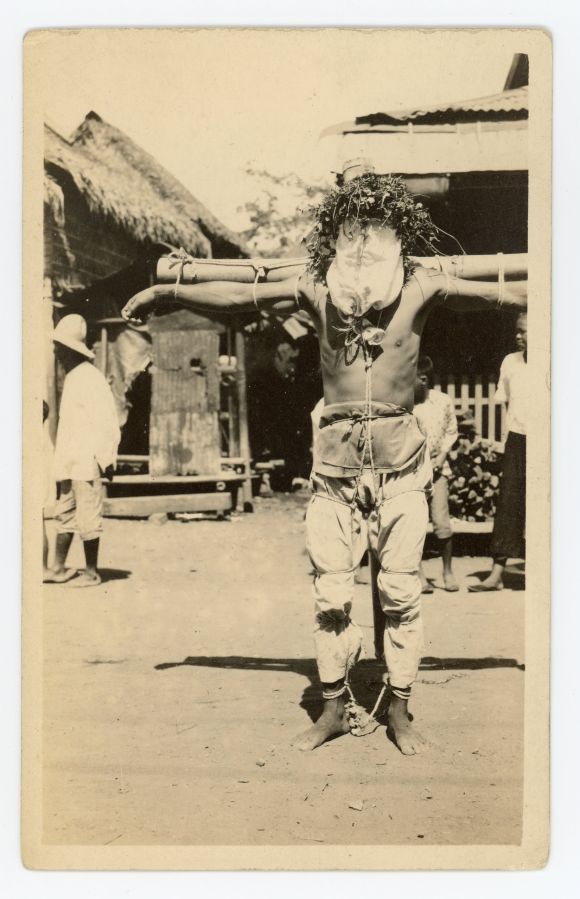 Man tied to cross wearing crown of thorns as penitents. In the runup to Easter, Christians around the world take part in rituals to mark Holy Week, including self-flagellation and crucifixion.