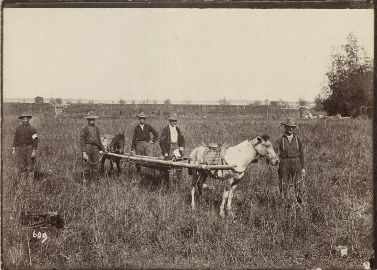 Subject: Army medics transport a wounded U.S. soldier on a litter on the battlefield. There is a breached stone wall in the distance. See also OFI-003300 for this same image as a halftone