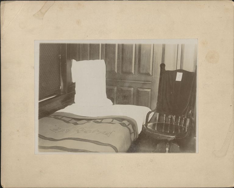 Subject: A bed and a chair and few other clues. Chair back cover is labeled "7" and bed blanket has indecipherable lettering.