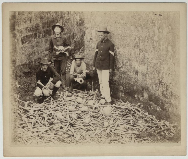 U.S. soldiers pose with skulls and bones, likely at Paco Cemetery in Manila. This image is identical to OFI-000011.