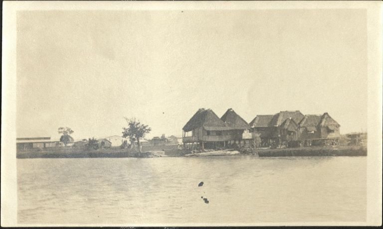 Subject: View across river at large connected series of nipa houses (or processing factory?) on bank.