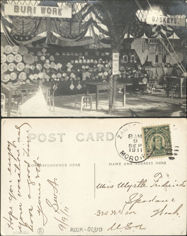 Subject: Covered market offering woven hats, baskets, and needlework; U.S. flags draped in rear.