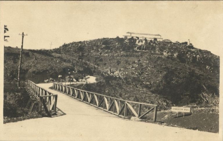 Subject: Looking over bridge to Mt. Mirador and the Jesuit obervatory, weather and seismic station in distance. The building was constructed in 1909.