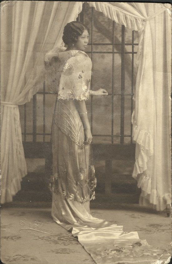 Subject: Studio photograph of unidentified Filipina standing by window, back to camera in long elegant dress.