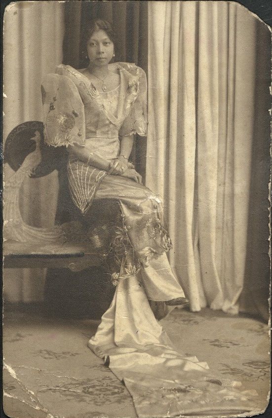 Subject: Studio photograph of unidentified Filipina sitting on peacock bench, facing camera in long elegant dress.