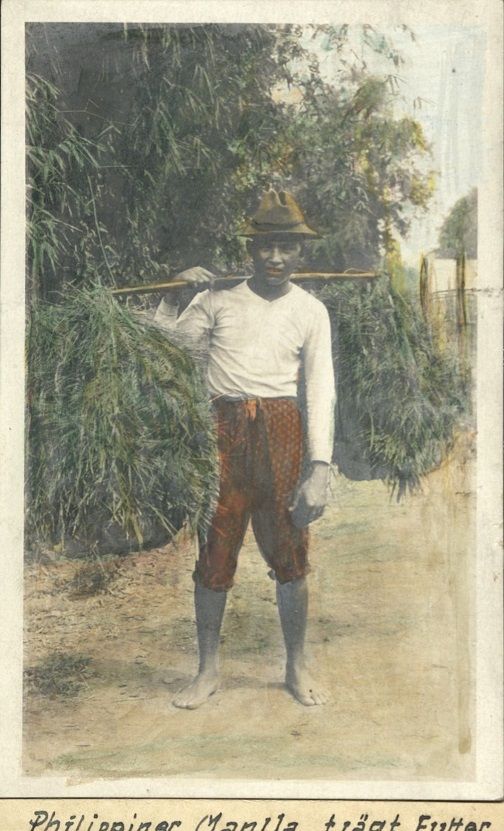 Subject: Filipino man carries two baskets of leafy greens (zacate grass or bamboo leaves?) balanced on pole on shoulder.