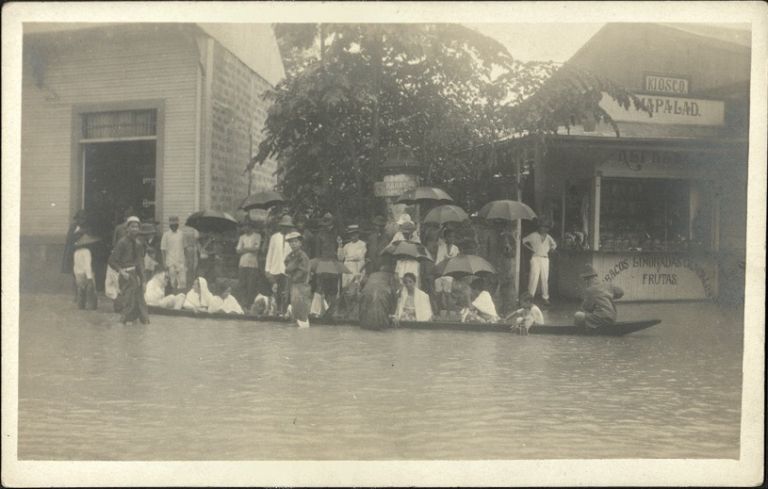 Subject: Large group of unidentified Filipinos, many with umbrellas, stand and sit by a flooded street, banca (small boat) and sari-sari store.