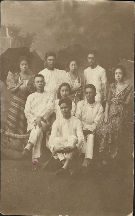 Subject: Group of 9 unidentified Filipino men and women standing and sitting in formal clothes in a photography studio.