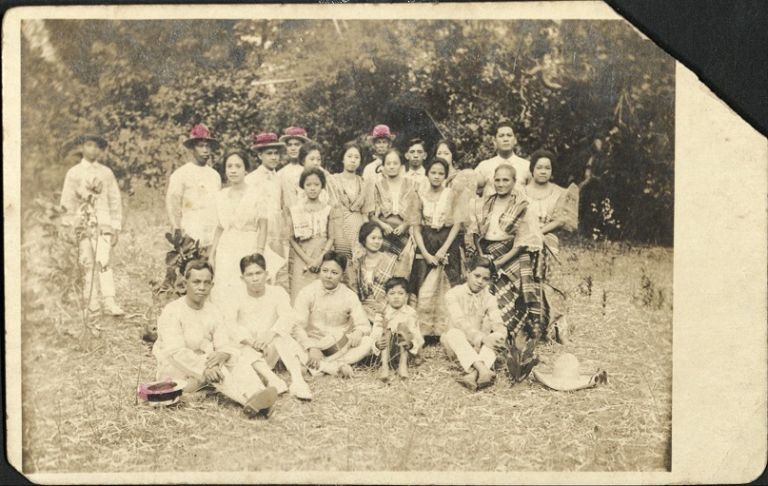 Subject: Group of 22 unidentified Filipino men, women, and children pose standing and seated outdoors in a clearing.