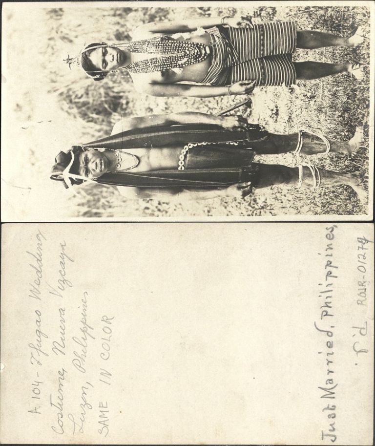 Subject: The elaborate headdress and G-string of the man and the heavy necklace of heirloom beads of the woman typify the traditional Ifugao costume of the early 20th century.