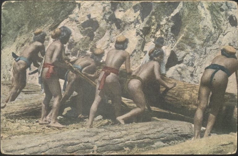 Subject: Six Igorot men roll a log across other logs near Sagada, Mountain Province.